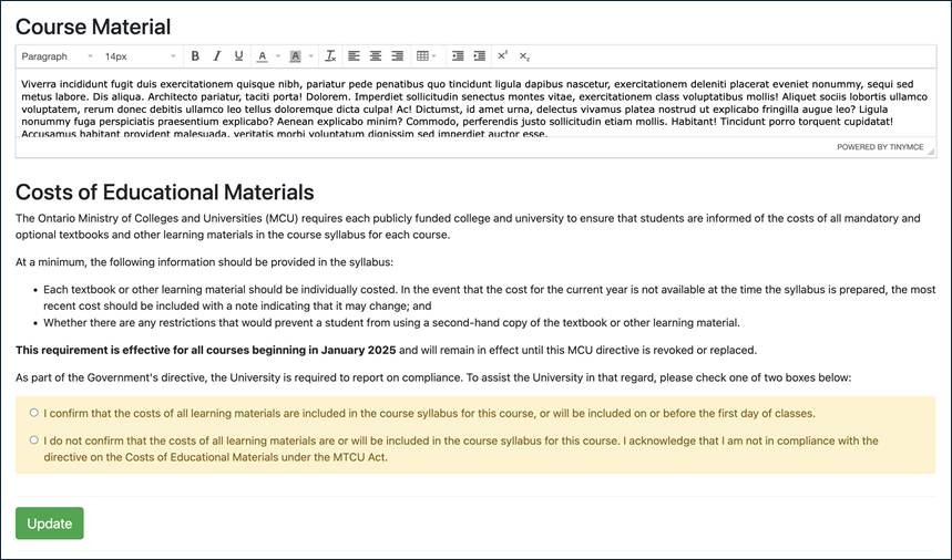 The Canvas syllabus template now includes a new section titled “Costs of Educational Materials” under the Course Materials tab on the Update Syllabus page.
